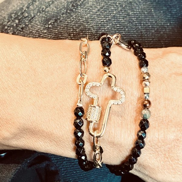 Bracelet Spirit trois tours, chaîne plaqué or 18 carats, onyx, pyrite, hématite, croix rhodiée.