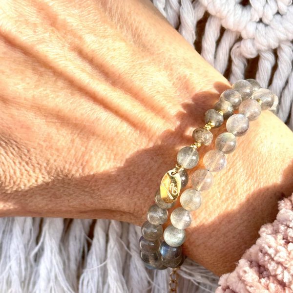 Bracelet labradorite, hématite et logo plaqué or 18K.
