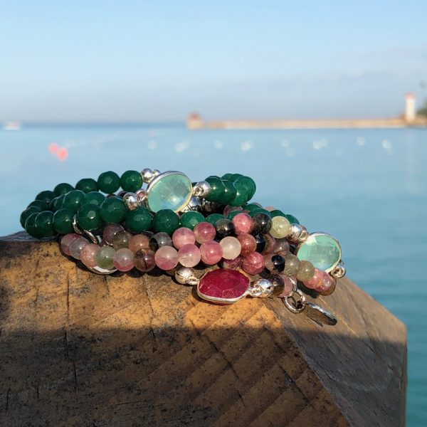 Bracelet 2 tours en Tourmaline et agate sertie argent fermoir ‘T’ en argent ou aimanté au choix (à préciser lors de votre commande)