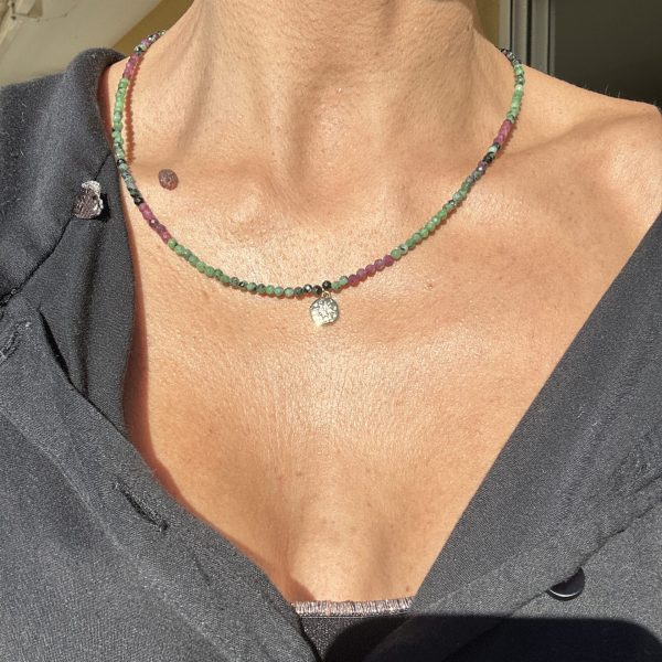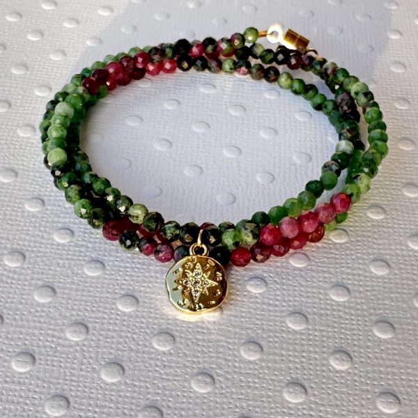 Le bracelet se compose de perles en pierre de tourmaline soigneusement sélectionnées, formant trois tours autour de votre poignet, ou pouvant également être porté comme un ras de cou pour un look polyvalent.