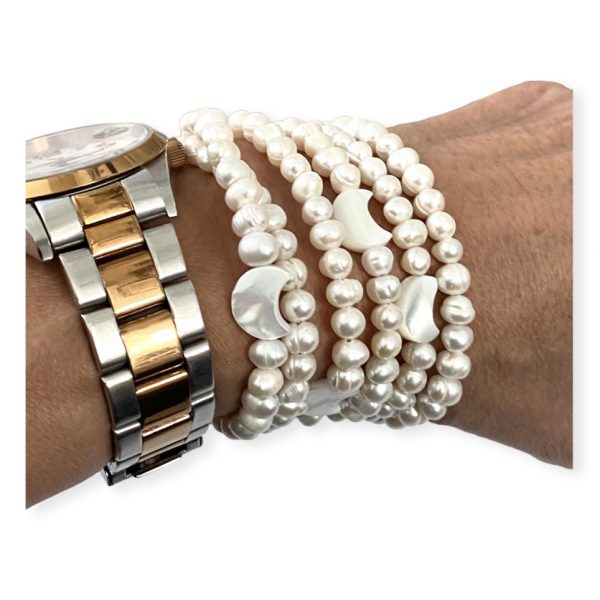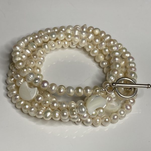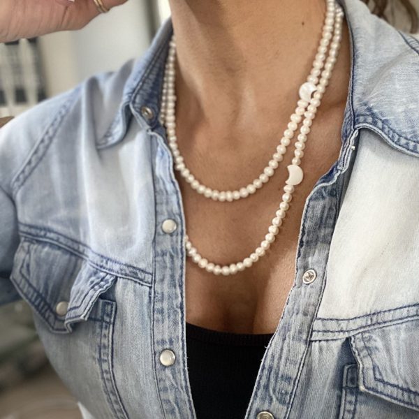 Collier à porter en simple ou double tours, ou bracelet multi tours en perle de culture eau douce naturelle et lune en nacre ,fermoir ‘T’ en argent 925/100ème.