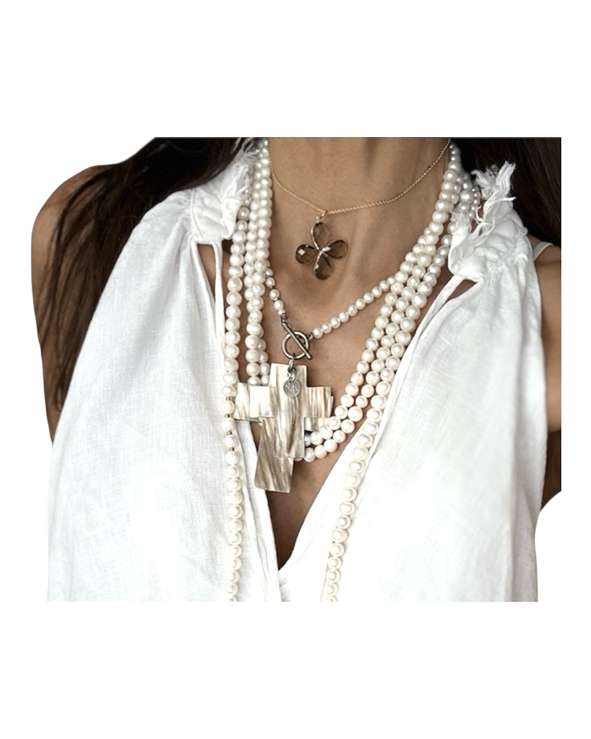 Collier double rang en perles de culture naturelles, sublimé par un fermoir T en argent 925 et une double croix en corne naturelle.