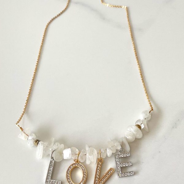 Collier Love chips en perles de Lune, sur chaine doré à l’or fin.