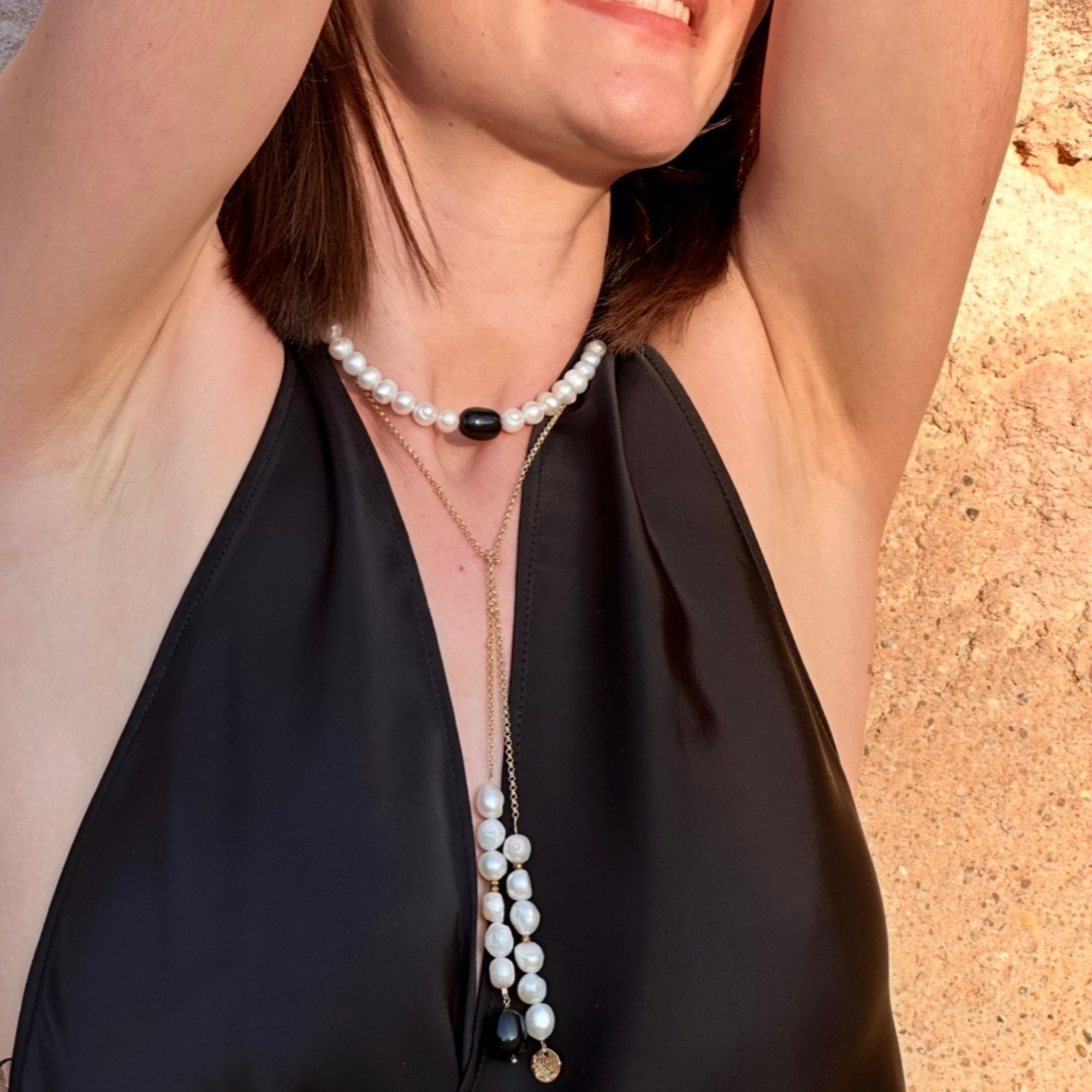 Matériaux : Perles naturelles blanches et noires, chaîne en laiton plaqué or 18K.