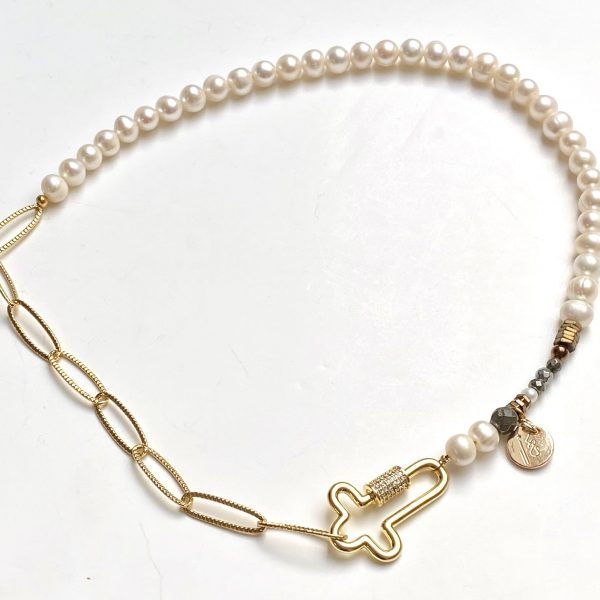Ras de cou en perles d’eau douce et chaine plaqué or 18K, une croix rhodiée l’accompagne en guise de fermoir, un subtil mélange