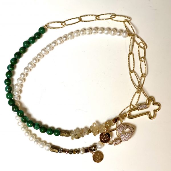 Ras de cou ‘Spirit’ en jaspe vert et quartz rutile, chaine plaqué or 18K, une croix rhodiée l’accompagne en guise de fermoir, subtil mélange.