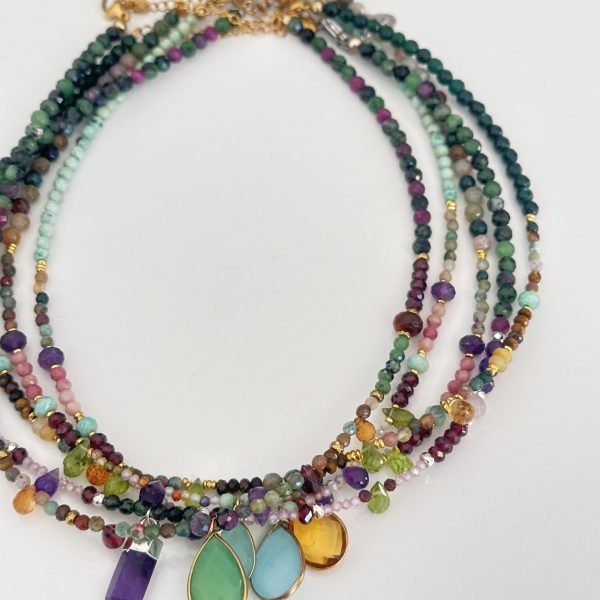 Succombez au charme de ce collier unique, composé d’une multitude de pierres fines minutieusement sélectionnées :Tourmaline, zoisite, grenat, amazonite, pendentif en agate facettée et sertie.