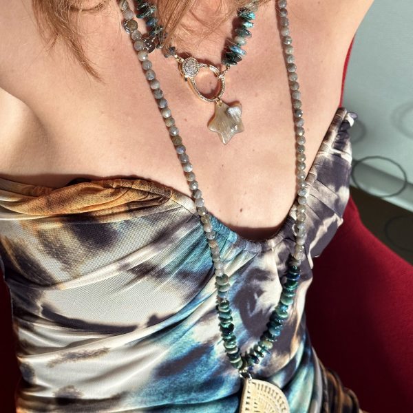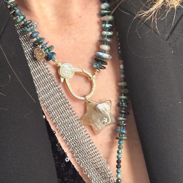Le Collier Éclat d’Apatite est une pièce élégante et raffinée qui allie la beauté naturelle des chips d’azurite à la sophistication d’un fermoir mousqueton strassé en plaqué or 18 carats.