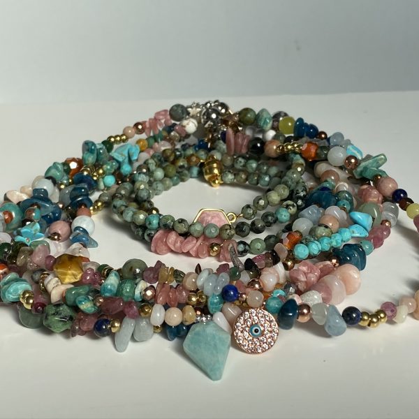 Agate, jaspe, une multitude de pierres semi-précieuses, pour ce ras de cou multicolore qui se porte également en bracelet deux tours.