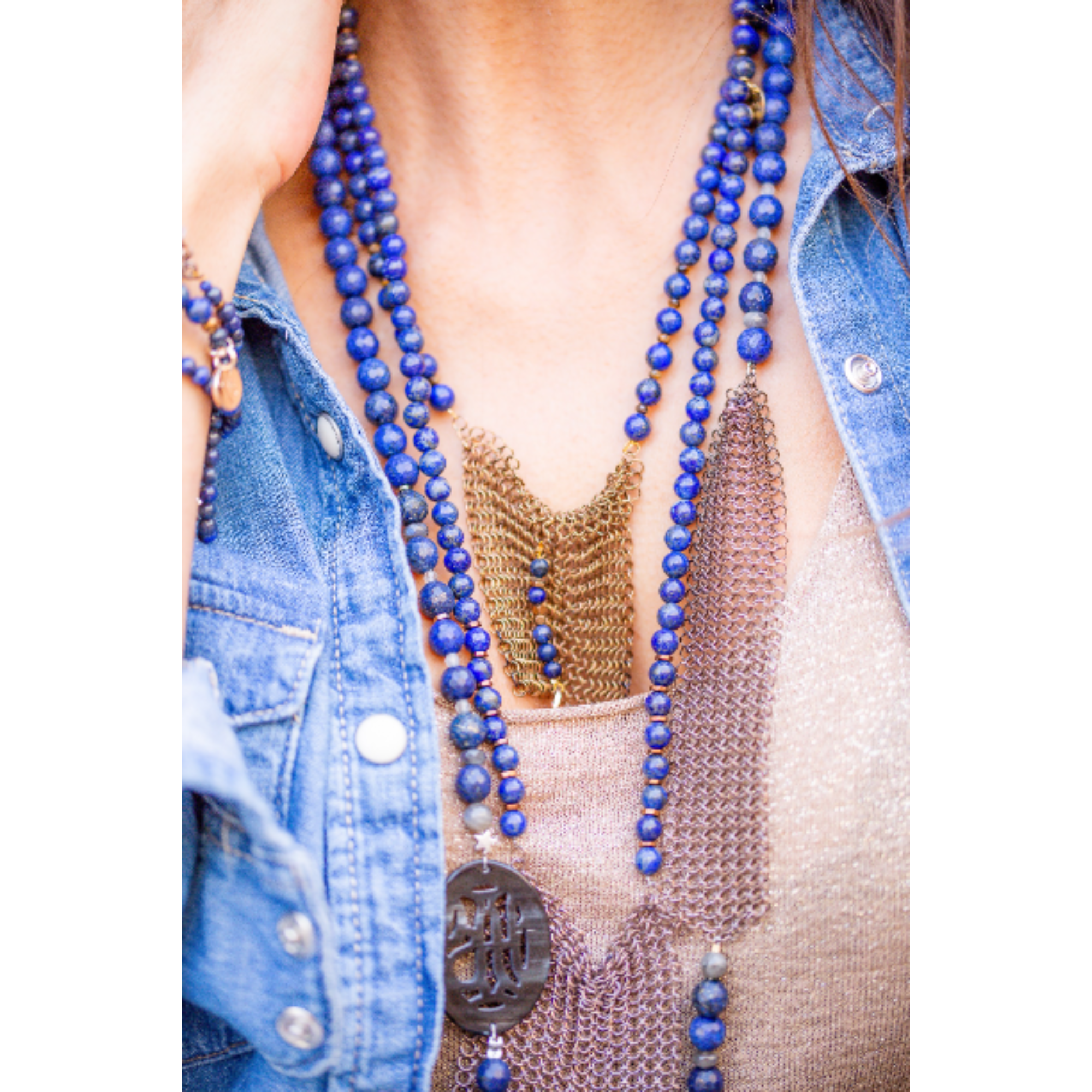 La cotte de mailles souple épouse naturellement le mouvement du corps, tandis que les perles de lapis lazuli apportent profondeur et élégance.