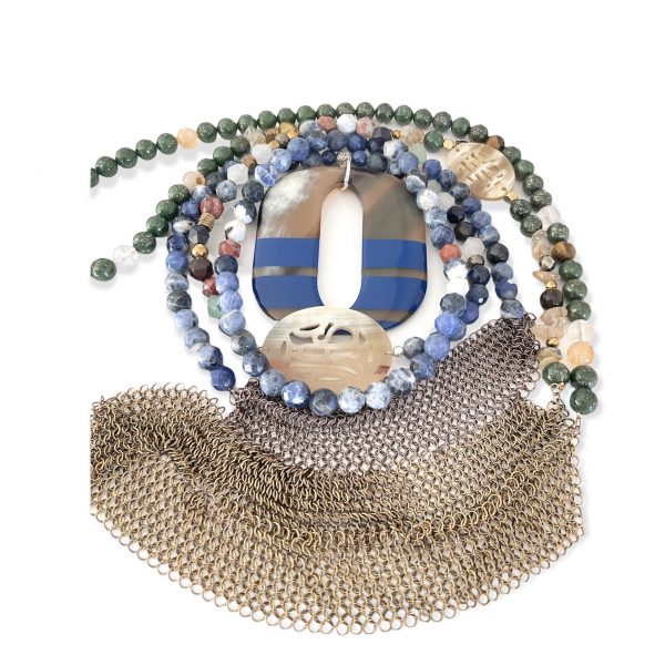 Sautoir Liv, pierres semi-précieuses sodalite, mélange agates, corne sur le coté, et cotte de mailles, pendentif laqué bleu.