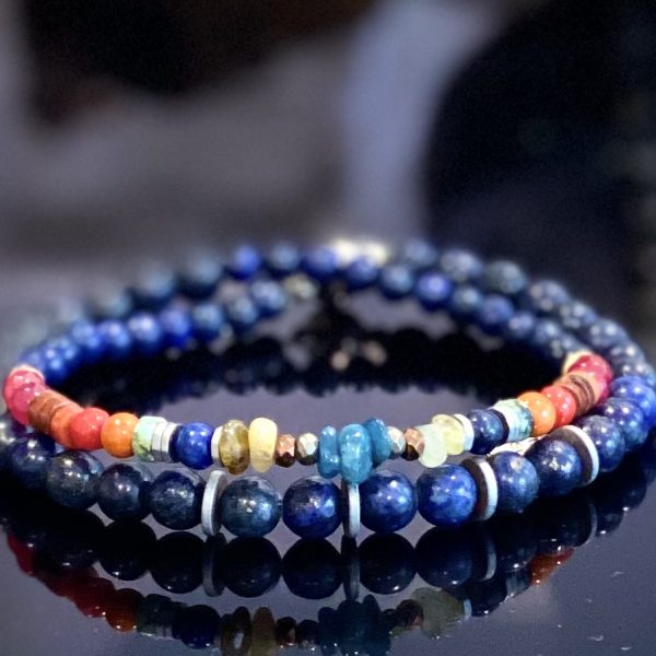 Lapis Lazuli pour ce bracelet homme double tour avec un mélange de pierres semi-précieuses, agates, hématite, grenat vert, apatite, turquoise africaine.